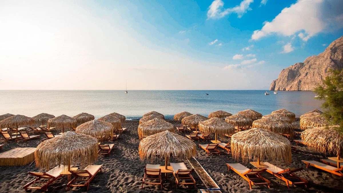 A Hotel Kamari Beach közvetlenül a tengerpart mellett helyezkedik el, így a vendégek néhány lépés alatt elérhetik a sziget ikonikus fekete homokos strandját és az Égei-tenger kristálytiszta vizét. A szálloda környezetében hangulatos tengerparti sétány, tavernák, bárok és kisebb üzletek találhatók, amelyek igazi görög nyaralóhangulatot biztosítanak.